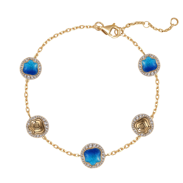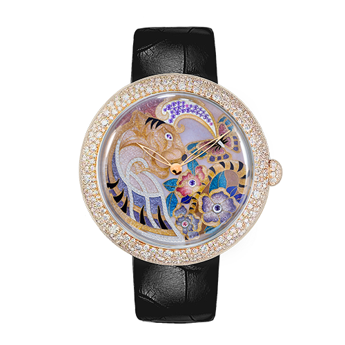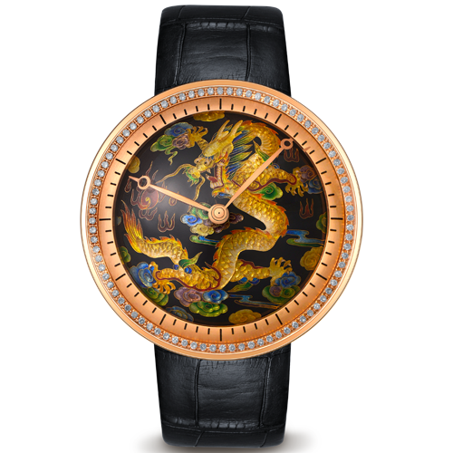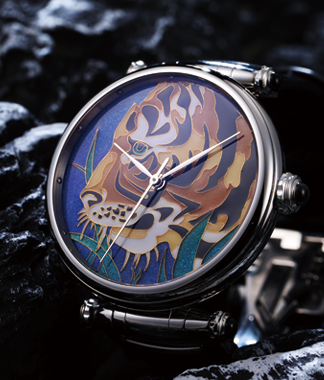 绿水青山、祥云缥缈,祖国山河壮丽,人与自然和谐共生、美美与共。腕表青绿山水为主图,色调清新,画面简约,以山之重承载情之深,祝福所戴之人福山寿海、江山永固。