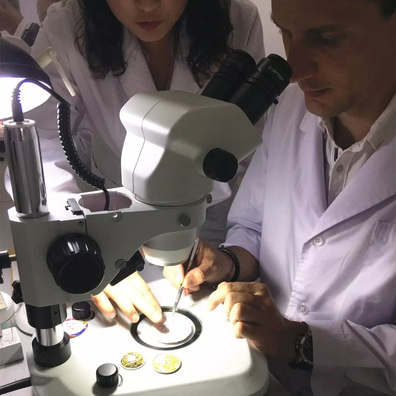 在目镜下仔细观看珐琅腕表的精巧绝妙