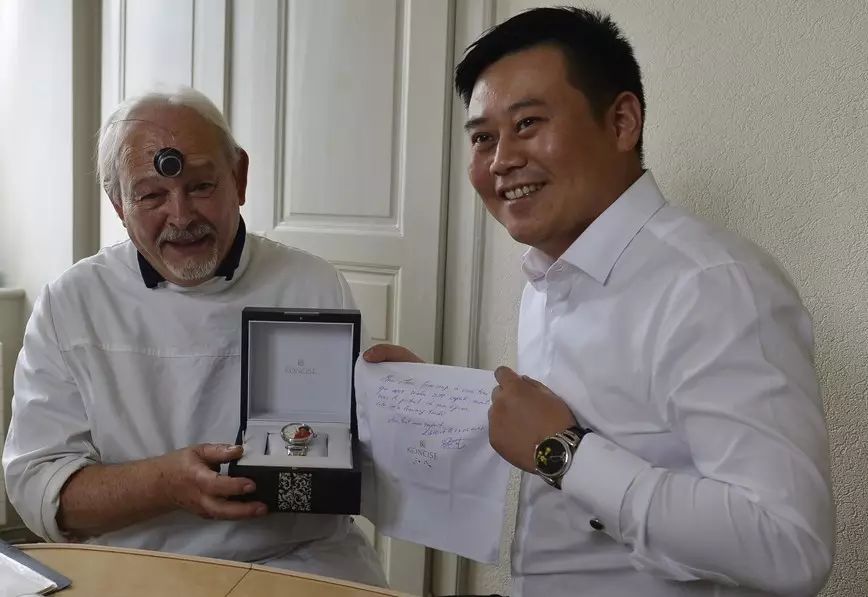 杜夫先生用目镜仔细观看这枚为自己夫人制作微绘肖像珐琅腕表,非常激动,他一再赞叹,“太逼真了,太棒了!”