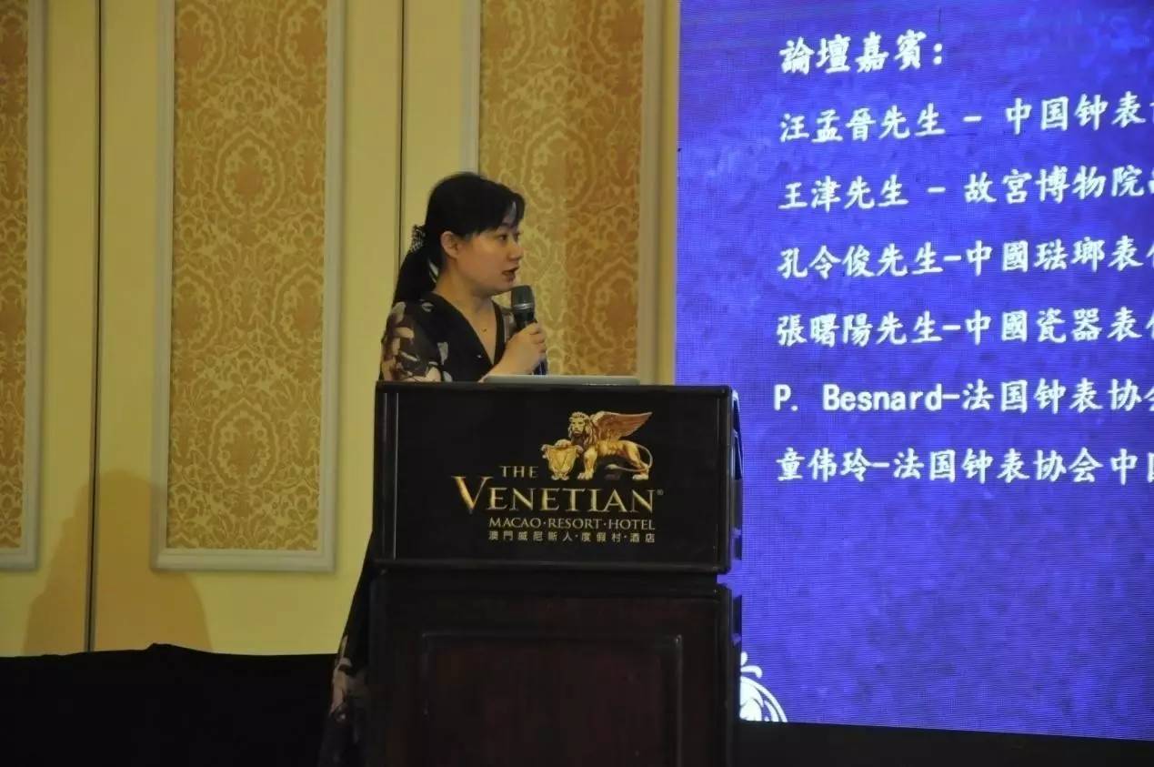 本届博览会首次在澳门举办,是第一次将非物质文化遗产与古代艺术结合的国际性盛会, 同时也是中国钟表艺术回本溯源的一次完美亮相。 大会组委会围绕非物质文化遗产传承这一主题,组织了一系列主题论坛。钟表界代表参加23日举行的分论坛,就“工匠精神”为主题,集体发声。 论坛由法国钟表协会中国首席代表童伟玲女士主持,中国钟表协会主席汪孟晋先生,故宫文保科技部钟表修复王津先生,中国珐琅代表孔氏珐琅创始人孔令俊先生,中国瓷器表代表人张曙阳先生,法国钟表和微技术联合会总代表/欧盟钟表联合会总代表Patri Besnard先生分别发言,并且与参会的澳门钟表爱好者、收藏家及澳门大学的学生展开了积极的互动讨论。