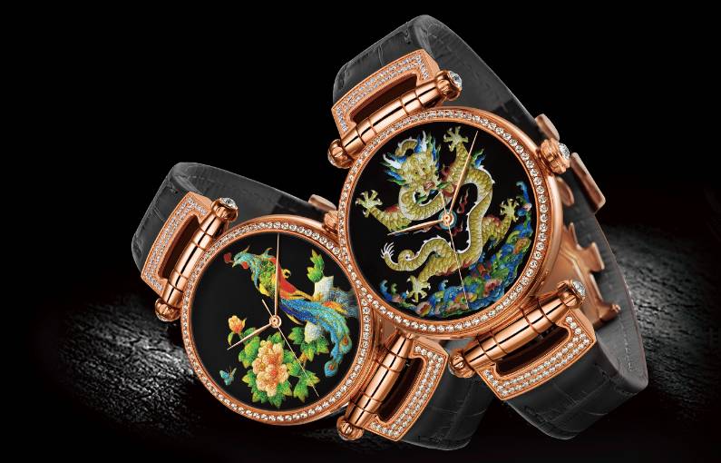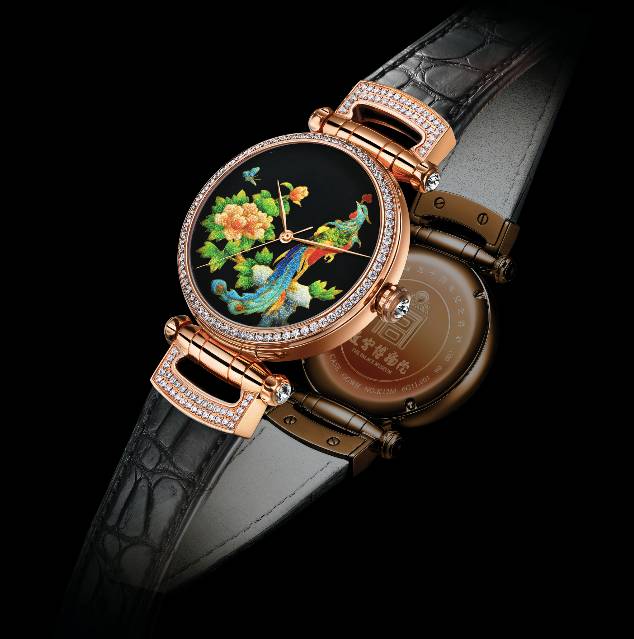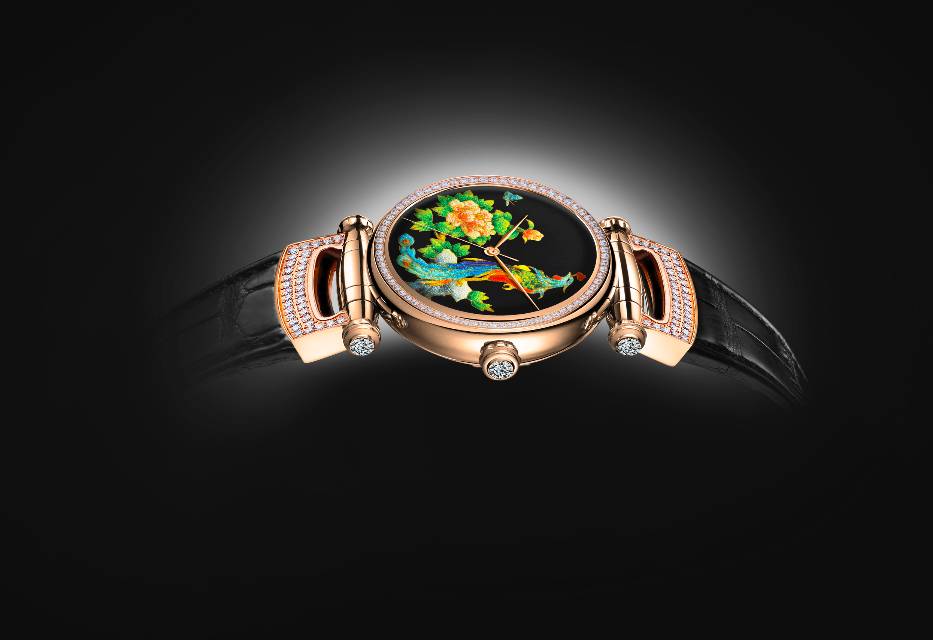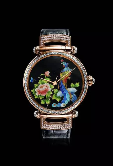 “凤舞九天”珐琅腕表则将绽放的牡丹同华贵的凤凰制作于同一面盘,通过牡丹与凤凰的斗艳展现凤凰的雍容华贵,牡丹的娇艳。