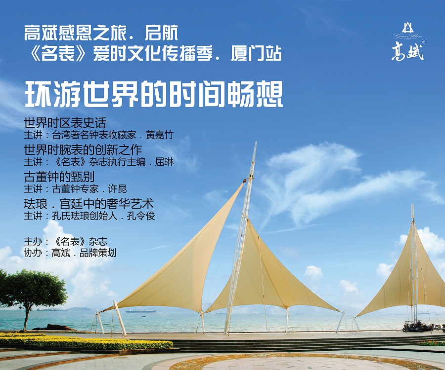 本次活动由中国钟表行业最具权威的《名表》杂志主办、高斌.品牌策划协办,以“环游世界的时间畅想”为主题,旨在向世界传递富有中国传统文化色彩的钟表艺术之旅。到场嘉宾有:中国钟表协会收藏委副主任汪孟晋先生,厦门钟表协会会长黄爱英女士,台湾知名钟表收藏家黄嘉竹先生,《名表》杂志主编孔繁金女士,国际独立制表人马旭曙先生,古董钟专家许昆先生,孔氏珐琅创始人孔令俊先生,东方设计装修董事长胡亮先生等。