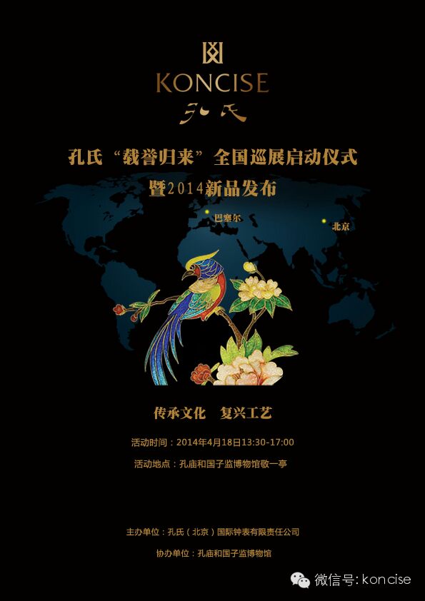 2014年恰逢孔子诞生2565周年,孔氏珐琅将以这次新品发布来纪念至圣先师孔子对中华民族做出的巨大贡献。孔庙悠久的历史积淀、深厚的文化内涵也与孔氏珐琅“传承文化 复兴工艺”的理念相契合。届时,孔氏珐琅将与众多嘉宾、媒体朋友分享2014巴塞尔展上的璀璨瞬间,流光溢彩的珐琅腕表将一一绽放在嘉宾的面前,让我们一起分飨每一部作品带来的心灵盛宴。孔氏全国巡展第一站,我们期待与您一起拉开这段神秘旅程的精彩序幕。