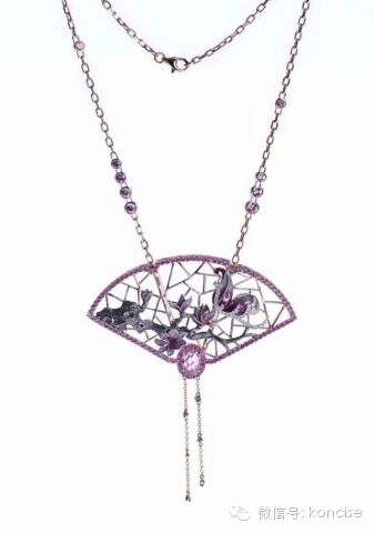 这款蝴蝶与玉兰花的吊坠,采用中国扇面的元素作为整体构图背景,扇面上方采用珐琅和珠宝工艺制作的蝴蝶翩翩欲飞,一派浪漫气息。扇面中用珐琅绘制的玉兰花似乎有清香散出,吸引蝴蝶闻香而来。扇面下方用黑金制作的玉兰树枝,自然优美,有旁逸斜出的态势。最下方的一颗主石以及垂坠下来的钻石则让整件作品典雅高贵。