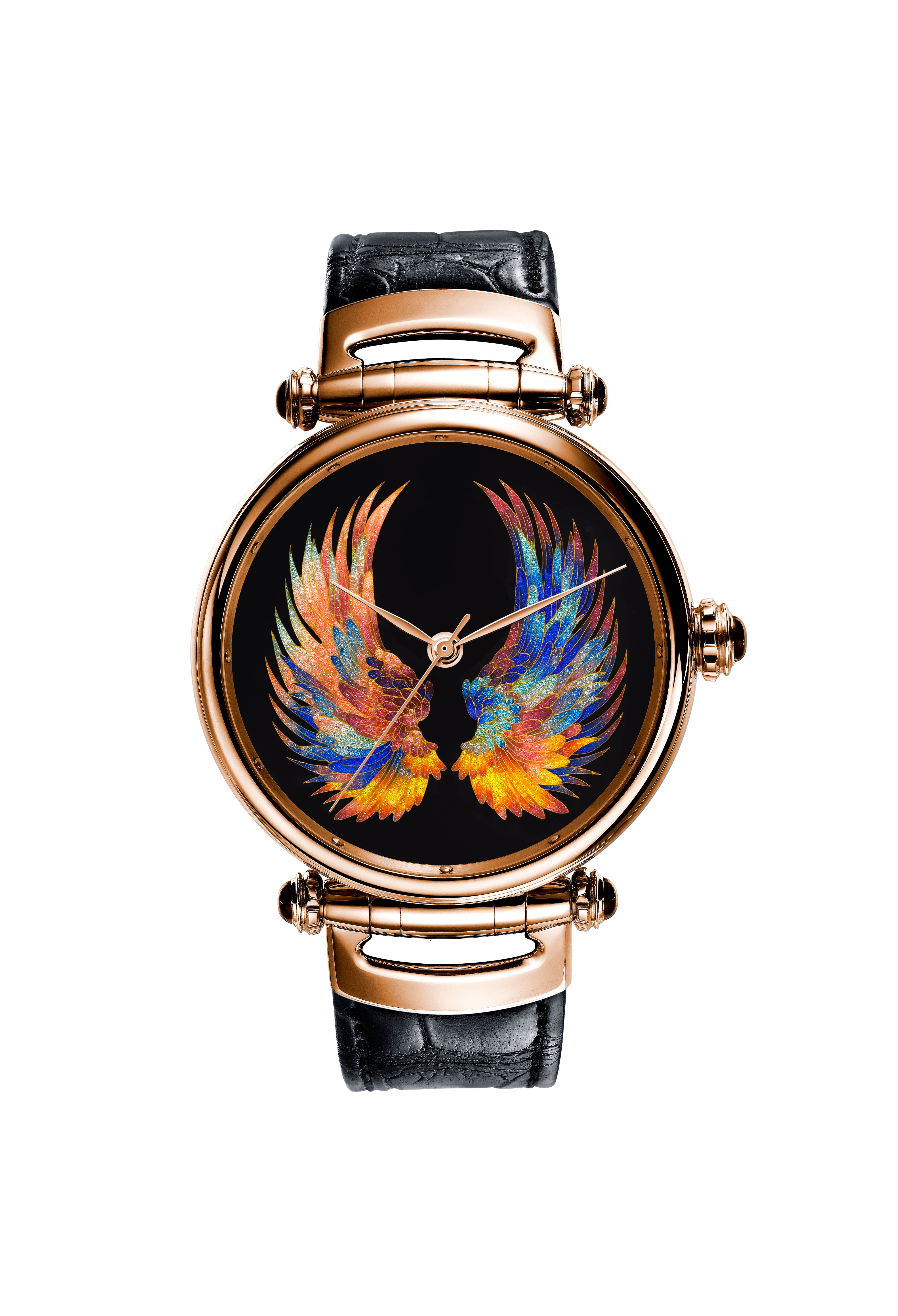 孔氏珐琅就是其中的参与者,在本次拍卖活动中,孔氏珐琅捐赠出一块“自由女神”黄金掐丝珐琅腕表。这是一款特别为爱而生的腕表。设计师用天使的两片羽翼象征着爱与力量,寓意为需要帮助的人们插上梦的翅膀,带去新的希望,绚丽的色彩,又仿佛女神降临将爱和希望洒满人间,带给他们一个五彩斑斓的人生。